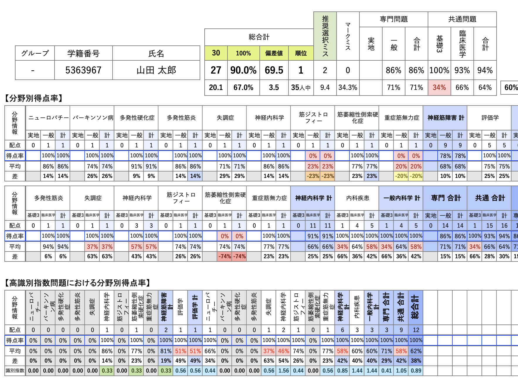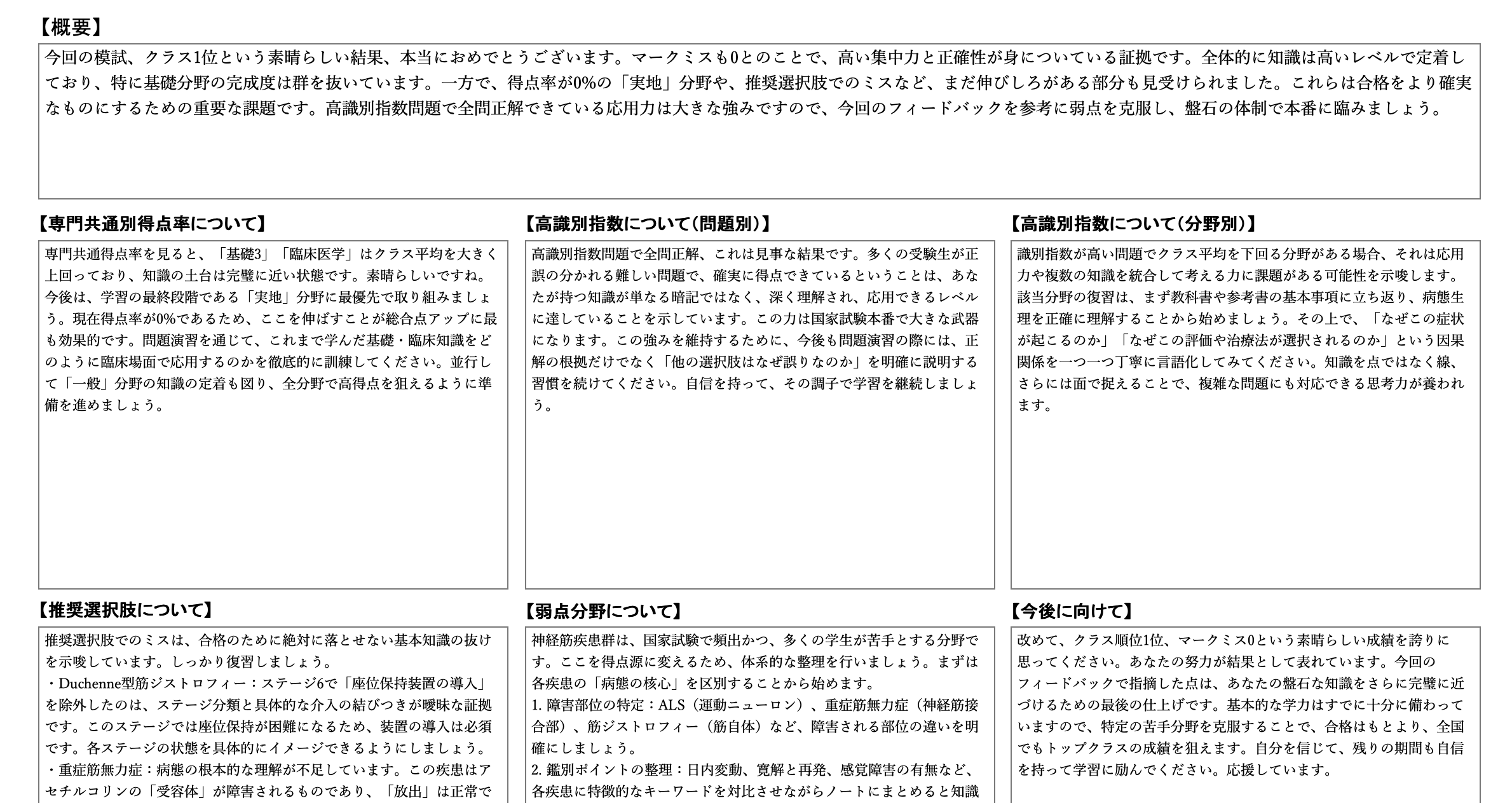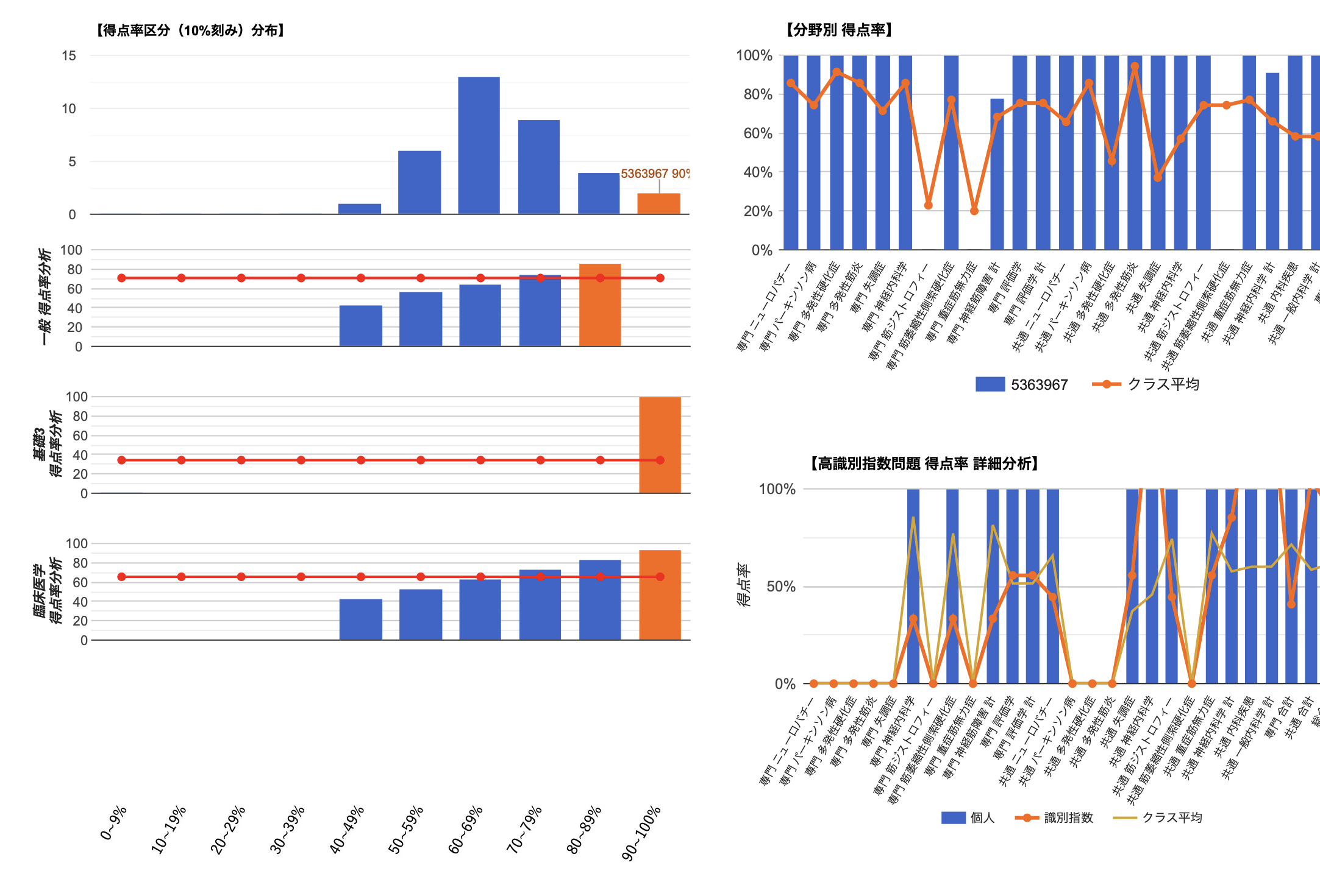 国家試験等の結果を多角的に分析します。単なる正誤を超え、得点傾向、推奨選択肢を元にしたミスの質、識別指数などを詳細に解析することで、学生一人ひとりの強みと弱点をピンポイントで可視化。このデータに基づき、画一的ではない、本当に響く個別フィードバックを提供し、学習効果の最大化と成績向上を強力にサポートします。